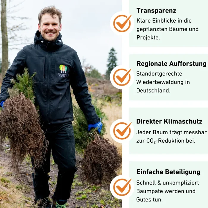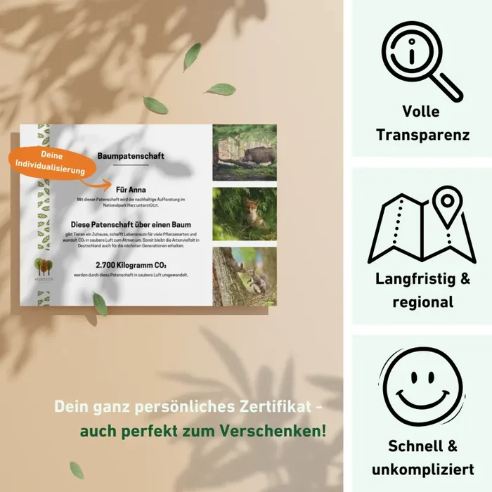 Unterstütze mit dem Amazon-Baum die Aufforstung der heimischen Wälder. Deine Patenschaft gibt Tieren ein Zuhause, schafft Lebensraum für viele Pflanzenarten und wandelt CO₂ in saubere Luft zum Atmen um. Somit bleibt die Artenvielfalt in Deutschland auch für die nächsten Generationen erhalten.