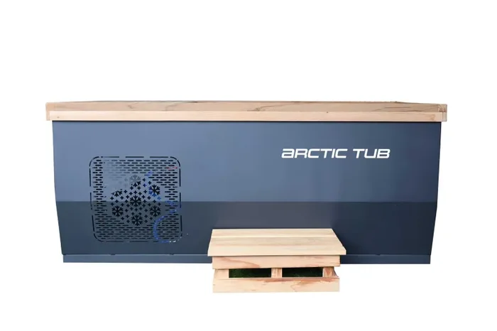 Das Mamut Tub ist ein Eisbecken von Arctic Tub mit Edelstahlwanne, Stahl-Außengestell und Zedernholzumrandung hinter der isolierten Edelstahlwanne ist genug Platz für das Arctic Cool Wasserkühlgerät.