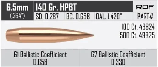Geschosse Nosler Reduced Drag Factor (RDF) 6,5mm, dia .264, 140grs (9g). SKU: 49824