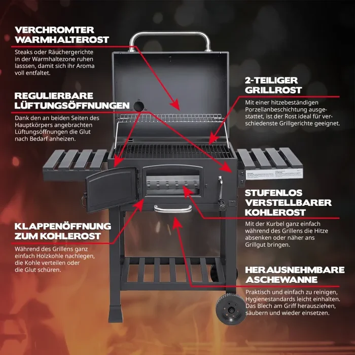 Dank seiner Kurbel für das Kohlen-Rost, lässt sich die Temperatur zuverlässig regulieren. Bei geschlossenem Deckel lässt sich außerdem wunderbar Smoken oder indirekt grillen!